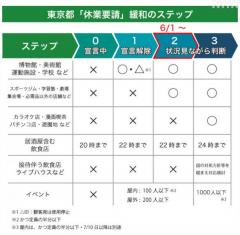 こんばんは。 前倒しされた可否判断によって、25日に全ての都道府県の 緊急事態宣言が解除されました。 東京都は、外出自粛・休業要請などの緩和措置について 段階的に緩和することにしました。 4段階あるステップのうち、一部を緩和する「ステップ1」に 昨日から移行しました。