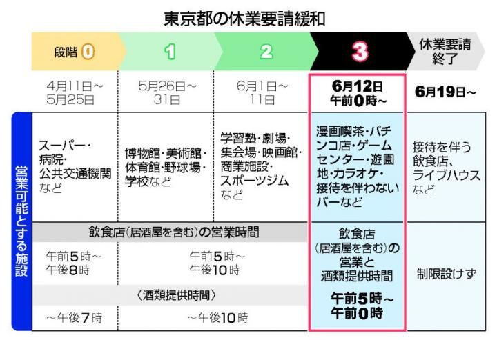 こんばんは。 前倒しされた可否判断によって、25日に全ての都道府県の 緊急事態宣言が解除されました。 東京都は、外出自粛・休業要請などの緩和措置について 段階的に緩和することにしました。 4段階あるステップのうち、一部を緩和する「ステップ1」に 昨日から移行しました。