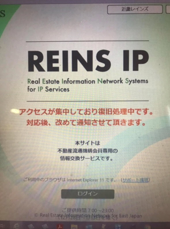 こんにちは。 本日から不動産会社のみが使用できる不動産流通システム (レインズ)が新バージョンになりました。 どんな感じに変わったのかなと楽しみに開始7時からログイン。 あれ・・・開かない。あれ・・・おかしいな? 何度もチャレンジするも先に進まない。 そうこうしているうちに、この画面。 9時から始業の会社や10時から始業の会社も次々ログインして いるのでしょう。新バージョン早々でガッカリ。 でも気長にいきますか。 |