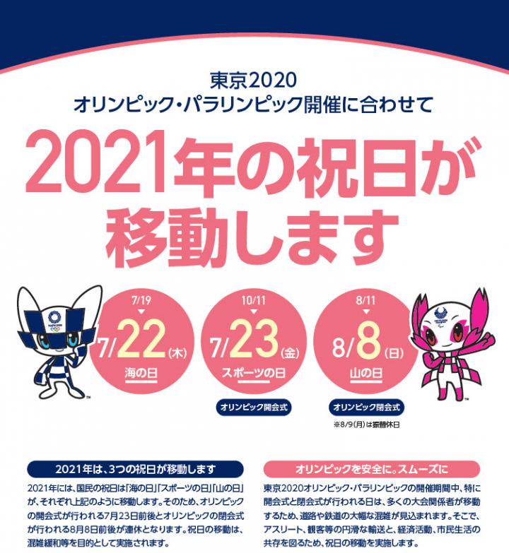 こんにちは。 明日は、成人の日 祝日です。 昨年12月に2021年祝日が移動になったのを御存知ですか? 東京オリンピック・パラリンピックの開会式前日・当日閉会式に あわせて移動になりました。