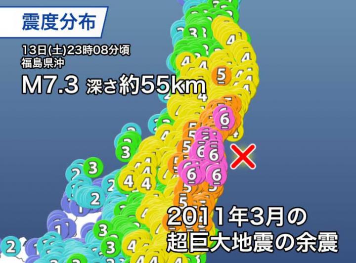 こんにちは。 2月13日午後11時8分ごろ、福島県沖を震源とするマグニチュード(M)7.3の 地震があり、最大震度6強を観測したそうです。震源の深さは約60キロ。 気象庁によると、2011年3月の東日本大震災の余震だそうです。