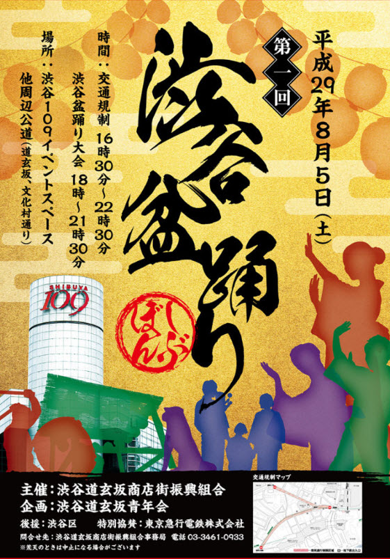 こんにちは。 本日2017年8月5日渋谷駅前のスクランブル交差点西側道路 文化村通り、道玄坂(「SHIBUYA109」周辺エリア)にて 「渋谷盆踊り大会」を初開催するそうです。