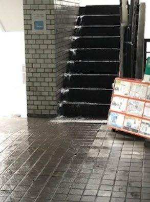 バラバラ落ちてくる雹の音をかき消すかのような雷。 そして、稲光がした瞬間、今度は建物が停電。 建物のブレーカーを確かめようと、地下の階段を降り ようと試みるも、階段が滝のよう。 お店の中に居ても、照明がつかないため暗い。 そしてエアコンがつかないため暑い・・・。 だんだんと日も暮れてゆく~。
