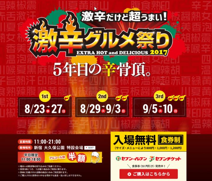 こんにちは。 本日から9月10日(日)までの期間、東京・新宿歌舞伎町の大久保公園で 『激辛グルメ祭り2017』が開催されるそうです。 このイベントは「激辛だけど超うまい!」がコンセプトのフードフェス。 今年で既に5回目の開催だそうです。 タイ、韓国、中国、四川、インド、モンゴル、ベトナム・メキシコの 激辛料理のほか、激辛のカレーライス、ラーメン、餃子など激辛グルメの 名店が集結。