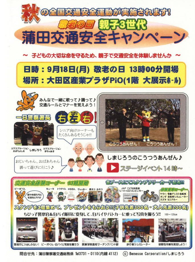 こんにちは。本日は敬老の日、祝日です。 9月21日~9月30日が秋の全国交通安全運動週間と いうこともあり、大田区蒲田では親子3世代で交通安全を 学ぼうというイベントが行われました。