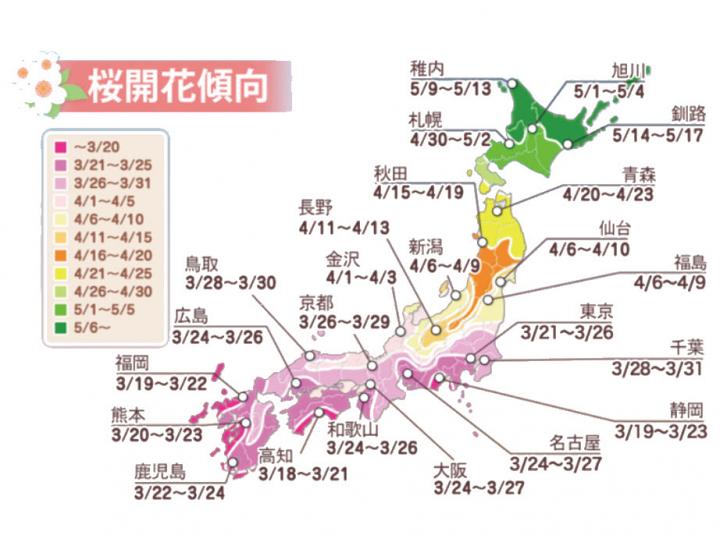 そこで調べてみると、各地気象台の標本木を観測し 標本木に桜の花が5~6輪咲いた状態を確認できた 最初の日を『開花日』としているそうです。 また、満開日は標本木で80%以上の蕾が開いた状態と なった最初の日だそうです。