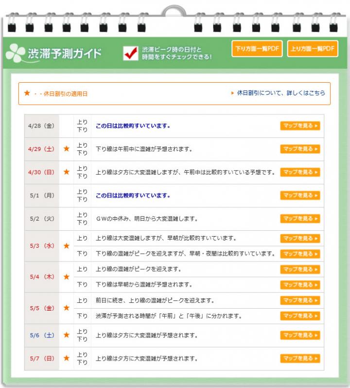 私は近場に出かける一人ですが、何と言っても 気になるのは渋滞です。 夜に出発が出来たら良いのですが、そうも行かず 思わず渋滞予測を調べてしまいました。 やはり日中は、大変混雑するようです。 渋滞は、事故が多くなります。時間と気持ちに 余裕をもって、出発したいと思います。 皆様も楽しいGWをお過ごし下さい。