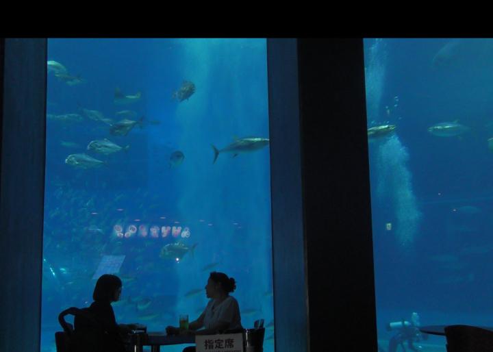 沖縄でしか見られない魚に感動。 大きな水槽を悠々と泳ぐ魚を眺めながらの カフェでのんびり。癒されました~。