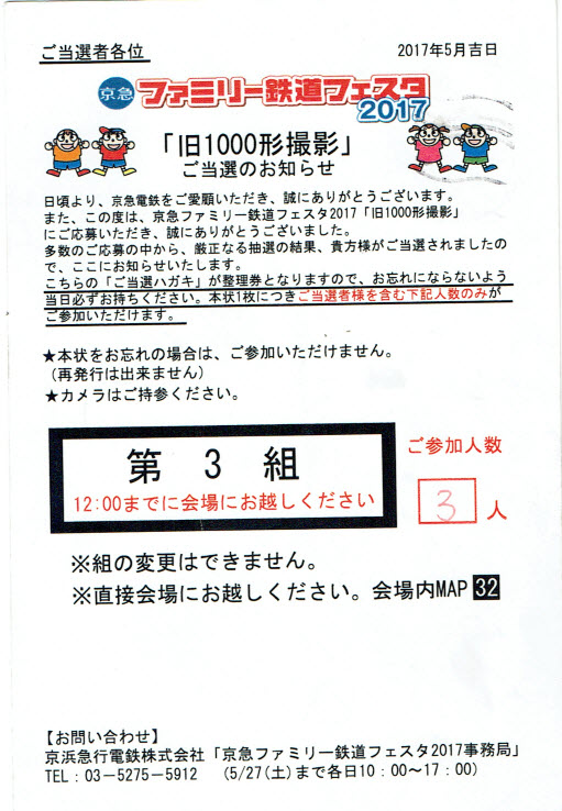 事前応募のイベントがあり、「運転台での撮影」や「旧1000形の撮影会」と いうのを見つけ、さっそく応募してみました。 すると・・・なんと!当選はがきが届きました~!! 運転台での撮影が希望だったので、ちょっと残念でしたが、当選はがきが くると、やはりテンションが上がりました。今から楽しみです。 |