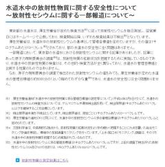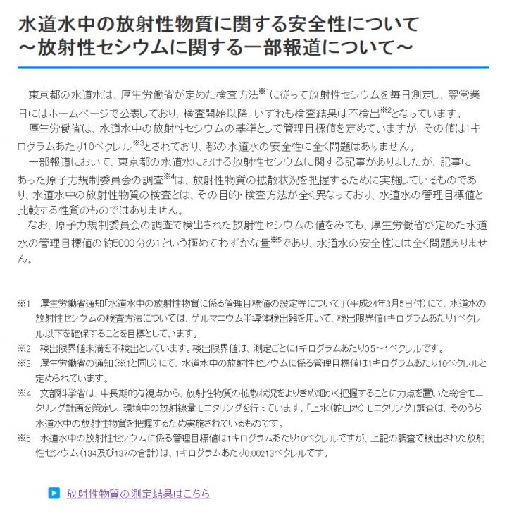 そして、もっと怖いのは、原子力規制委員会の調査報告が 報道で騒がれ、早々に東京都水道局が『東京水は安全』という 内容をホームページに掲載。 その後、一年経った現在、原子力規制委員会の調査報告が ホームページに掲載されていないことです。 これは、東京都水道局の圧力があったと思えて仕方ありません。 東京水は怖い。これを保育園に言っても、わかってもらえない でしょう。なにせ保育園の先生は公務員ですから・・・。