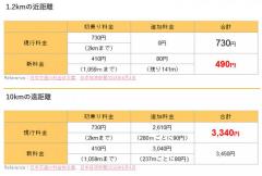 ただし、初乗り後の加算も変更されました。 280メートルごとに90円→237メートルごとに80円です。 従来の運賃より約1.7キロメートルまでは値下げとなり 約6.5キロメートル以上では値上げになるそうです。