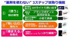 まず、青いUVライトで蚊を誘い出す(紫外線に集まりやすい) ➡黒い本体でさらに誘う(蚊は黒色を好む) ➡本体にある小窓に入り込む(蚊は物陰に隠れる習性) ➡蚊が空気清浄機へ近づくと・・・!! ➡空気清浄機の吸引力で本体内に引き込まれる~~~ ➡内部の粘着シートにくっつく(捕獲完了)