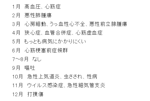 病気といえば、以前に生まれ月によってかかりやすい 病気があるのを御存知でしょうか? 嘔吐や虫刺されや打撲は、どの月でもなるとは思うの ですが・・・。どうですか?当たっていますか? ←こちらを見て、病気対策してみてはいかがでしょうか。