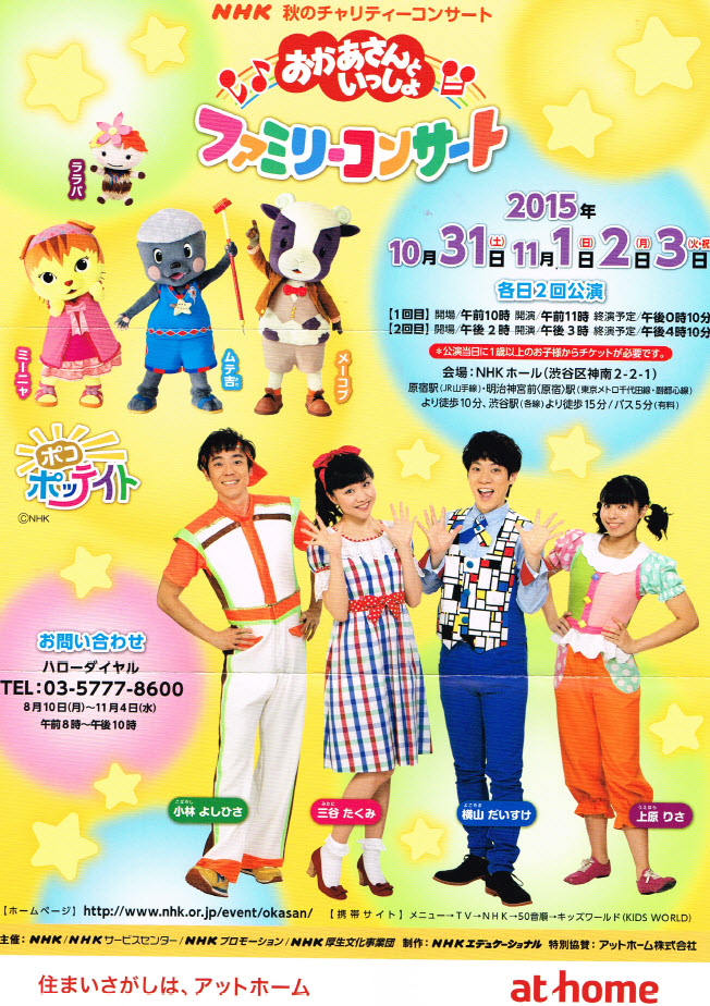 こんにちは。 昨日、子供をつれ家族3人でNHKホールへ行ってきました。 不動産ポータルサイトのアットホームが協賛している 「おかあさんといっしょ ファミリーコンサート」です。 アットホーム担当 藤本さんから御招待していただきました。 しかも、なんと席は1階の5列目をとって頂きました! 藤本梨加さん、本当にありがとうございます。