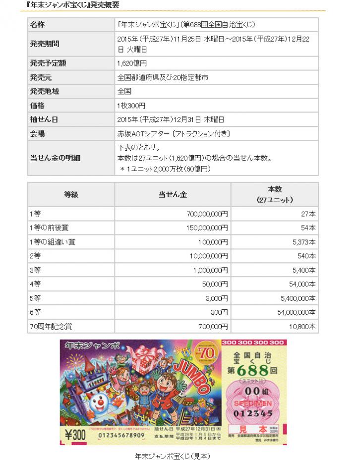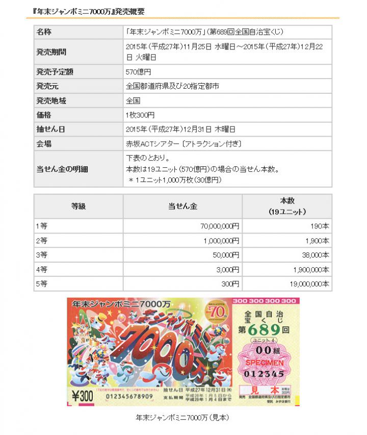 こんにちは。 いよいよ本日、2015年(平成27年)『年末ジャンボ宝くじ』(第688回全国自治宝くじ)と 『年末ジャンボミニ7000万』(第689回全国自治宝くじ)が全国同時発売されます。 今年の『年末ジャンボ宝くじ』は、1等賞金が7億円、1等の前後賞が各1億5,000万円 1等・前後賞合わせた賞金額は10億円と宝くじ史上最高額の宝くじだそうです。 また、今回宝くじの発売70周年記念として、特別賞「70周年記念賞」70万円が10,800本 用意されているとのこと。