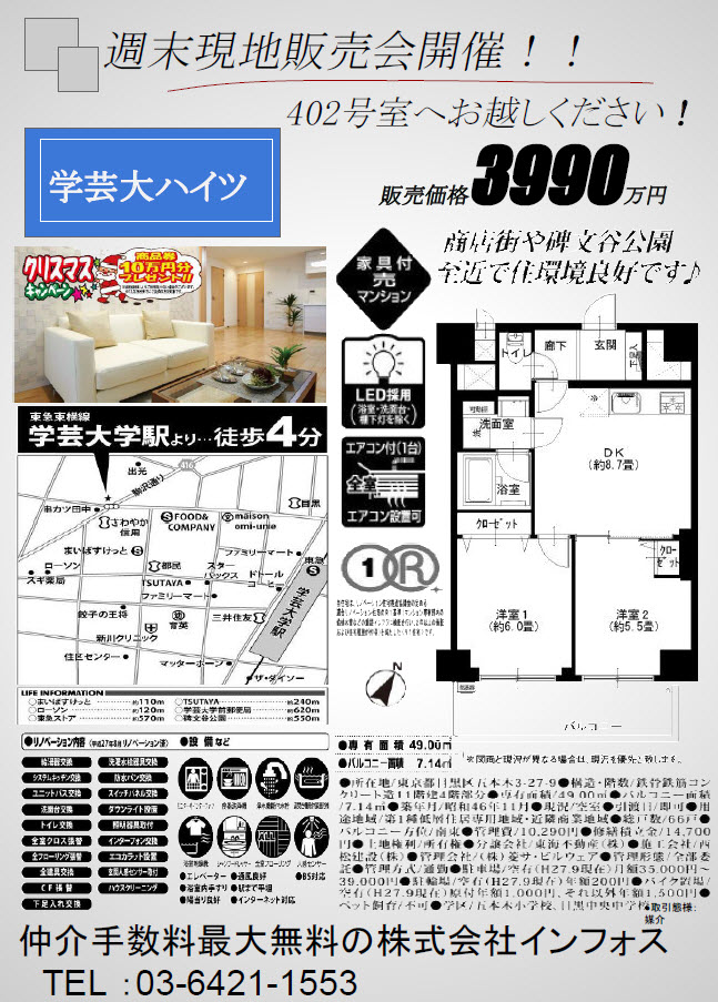 違う業者さんが現地販売している。 しかも同じ部屋を・・・。嘘でしょ?と目を疑う。 人は本当に驚くと2度見するのですね・・・。 何故ダブルブッキング。泣きながら帰りました。 インフォスで学芸大ハイツを購入すると、手数料 不要です・・・ブログで呟いてみました。 |