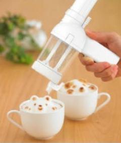 もう1つ。本体の泡立てカップにミルクを入れて スイッチを押すと泡立てされ、ドリンクの上に 飾れば、3Dラテアートの完成です。