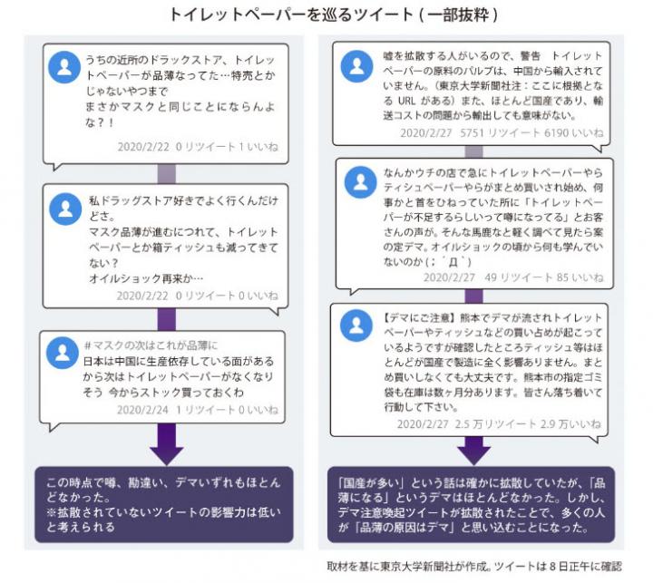 こんばんは。 一週間ほど前にTVで、海外ではトイレットペーパーが品薄になっていると いうニュースをみました。 その日に不動産会社の社長の方々と説明会で会った時も「マスクの次に トイレットペーパーが無くなるから買っておいた方が良いよ。」と言われ ました。 そして、本当にお店から次々とトイレットペーパーが消えました。 このトイレットペーパー騒動は、どこかの誰かがデマを流したことで 買い占め、買い溜めが起きたと言われています。 インターネットで流されたデマの出所を皆が探しまわる犯人捜しとなって います。