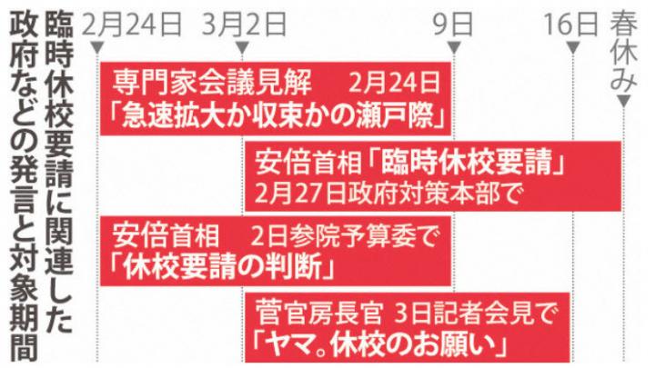 こんばんは。 安倍晋三首相は2月27日、新型コロナウイルスの感染拡大を防ぐために 全国すべての小中高校と特別支援学校について、3月2日から春休みに 入るまで臨時休校するよう要請しました。