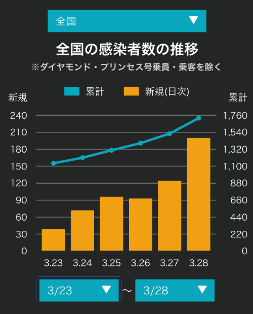 オリンピック延期後に徐々に増えてきたコロナ感染者数。 全国で200人~300人でしたが、4月7日からは500人以上に。 高齢者の多い日本ですから、人々の行動を制限してもコロナ感染者数を増加 させるわけにはいきません。ステイホーム。お家で過ごそう。 |