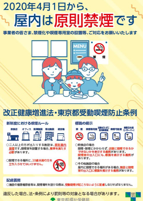 例えばタバコ。18年に成立した改正健康増進法は、受動喫煙の防止を目的としていて これまで喫煙が許可されていた屋内施設が今日から原則禁煙になる。 今回の法令と対象になるのは、多数の利用者がいる施設や旅客運送事業船舶・鉄道 飲食店などの施設。居酒屋やパチンコ店なども含まれています。