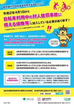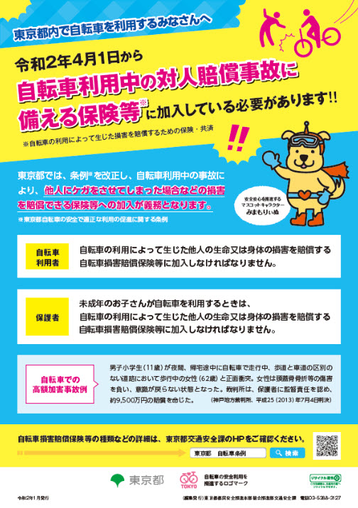 また、自転車。自転車を利用する全ての方が、自転車の損賠賠償保険に加入する事が 義務付けられました。自転車を利用しているときに事故を起こして、相手にけがを させた場合などの損害を補償する保険です。 大人、子供を問わず、都内で自転車を利用する人が対象です。 未成年の子供が自転車を利用する場合は、保護者が加入しなければなりません。