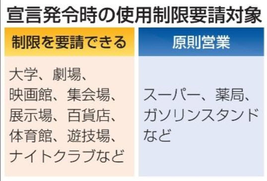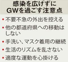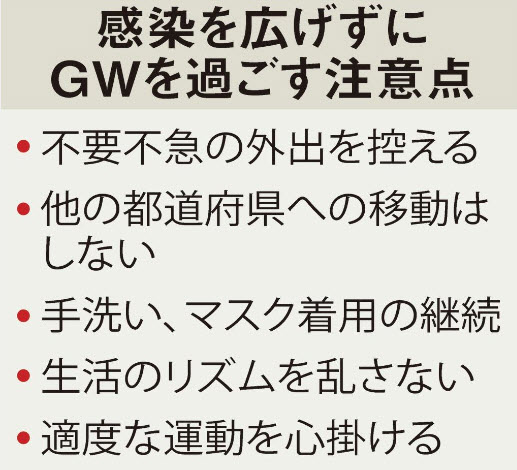東京都、神奈川県、埼玉県、千葉県、大阪府、兵庫県、福岡県 北海道、茨城県、石川県、岐阜県、愛知県、京都府 →引き続き、極力8割の接触削減が必要
