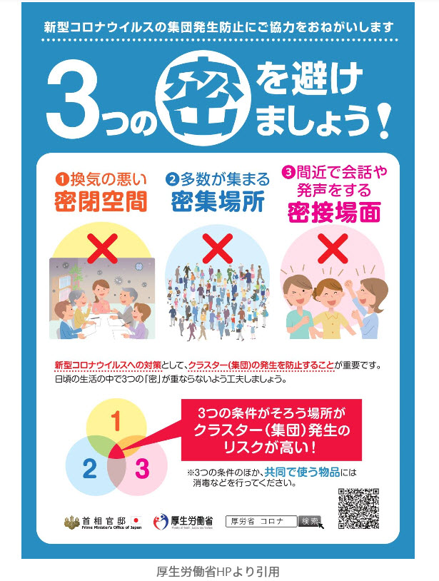3密(3つの密)とは、密閉、密集、密接からきた言葉です。 集団感染が起こった場所の共通点を探した際、この3つの密が 共通となっているということが分かり、コロナ感染を避ける ためにもこの3密を控えるようにする事を求められています。 |