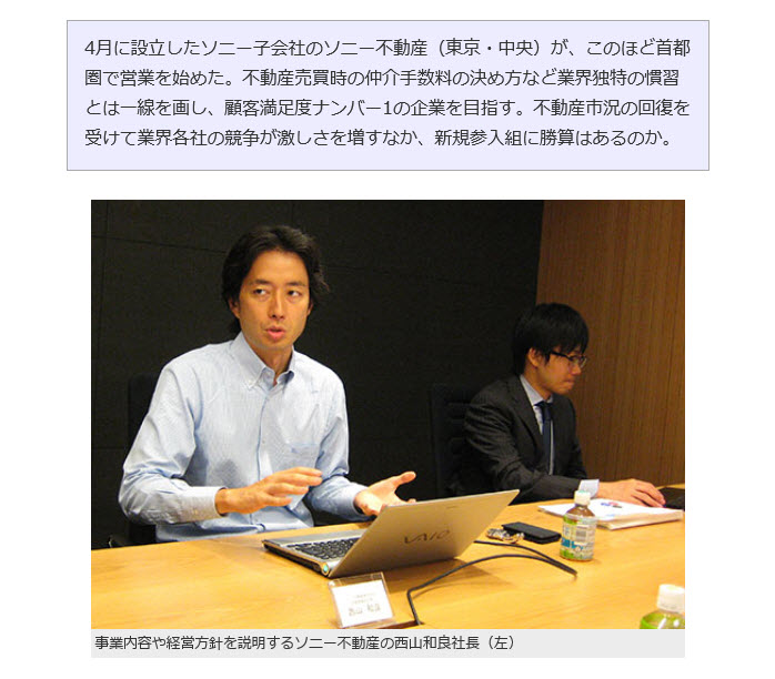 こんにちは。 最近、不動産業界に話題になっているのが ソニー不動産㈱の手数料変動型導入です。 8月1日開業しました。 西山社長は、売上高や利益でナンバー1は目指さずに 消費者目線でつくった消費者のための会社にしたいと おっしゃっています。 それでも3年後に株式を上場、5年後に売上高500億を 目指しているのだそう。