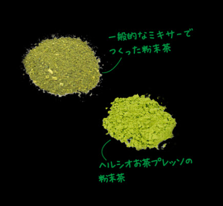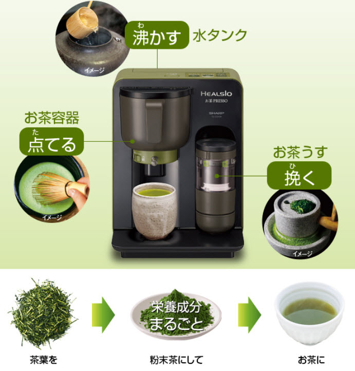 こんにちは。 本日は、現在とても気になっている電化製品のお話です。 『ヘルシオ お茶PRESSO』コーヒーメーカーのように手軽に 緑茶が淹れられるお茶メーカーです。 市販の茶葉から石臼で挽いたような粉末を作り、茶道で 茶筅を使って点てたお茶のような緑茶が淹れられます。 粉末は、とても細かいので、お湯にサッととけます。