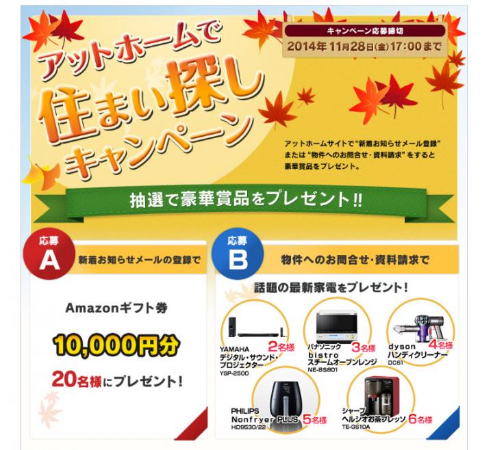 こんにちは。2014年10月1日~11月28日まで アットホームで住まい探しキャンペーン実施中です。 対象期間中、『新着お知らせメールの登録』または 『お問合せ・資料請求』すると豪華賞品が抽選で 当たるキャンペーンです。