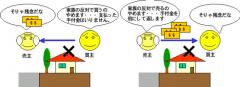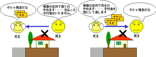 例えば、買主が手付金1万円で契約し、ローンの申し込み等を 行い、いよいよ決済日が近づいてきた・・・という時に売主様より 連絡があり「あなたより高い金額で購入してくれる買主が現れた。 手付は倍返し(2万円)するので契約解除して欲しい」と言ってきた。 また逆に、買主様が「もっと良い物件が見つかったので手付金 (1万円)放棄します」と言ってきた。