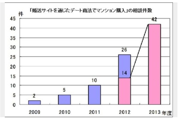 注意を呼びかけている。 2009年度から毎年2倍以上のペースで増加。 2013年度は12月までに42件と、すでに前年度全体の26件を上回っている。 相談者は女性が男性の2倍以上で、30代女性が最も多い。 ある相談事例によると、30代の女性は婚活サイトで自称「投資コンサルタント」と 知り合い数回食事をした後に「君にはマンション投資が向いている」などと言われた。 男性の職場で書類数点にサインをし、その後、一緒にマンション販売業者の事務所に 出向いて本契約に署名。 さらに販売業者と3人で銀行に行って融資の手続きをしたが、その後男性と連絡が