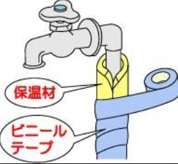 屋外の水道管や蛇口には、市販の保温材や電気の凍結防止帯を 巻くと効果的です。(発砲スチロール製の保温材や凍結防止帯は ホームセンターなどで取り扱っています。)