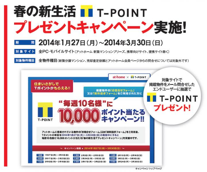 こんにちは。 今日は、アットホームより耳寄りなお知らせです。 1/27~3/30までに掲載物件の『お問い合わせフォーム』または 『資料請求フォーム』を御利用の方にTーPOINTのポイントが あたるようです。 春の新生活プレゼントキャンペーンだそうです。 弊社のホームページにアットホームのリンクがございますので どうぞキャンペーンに参加してみてはいかがでしょうか・・・