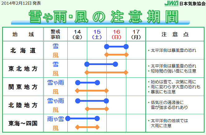 先週8日(土)ほどの記録的な大雪になる可能性は小さいですが 交通機関等に影響を与えるようなまとまった雪になる可能性は あります。 なお、南岸低気圧に伴う首都圏の雪の予測は変わりやすいため 今後の気象情報に十分ご注意ください。 |