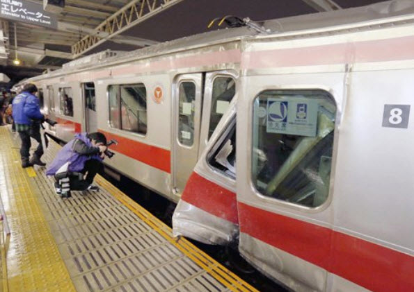 15日午前0時半ごろ、川崎市中原区の東急東横線元住吉駅で 停車していた渋谷発元町・中華街行き普通電車(8両編成)に 後続の同じく渋谷発元町・中華街行き普通電車(同)が追突。 後続電車の1、2両目が脱線した。