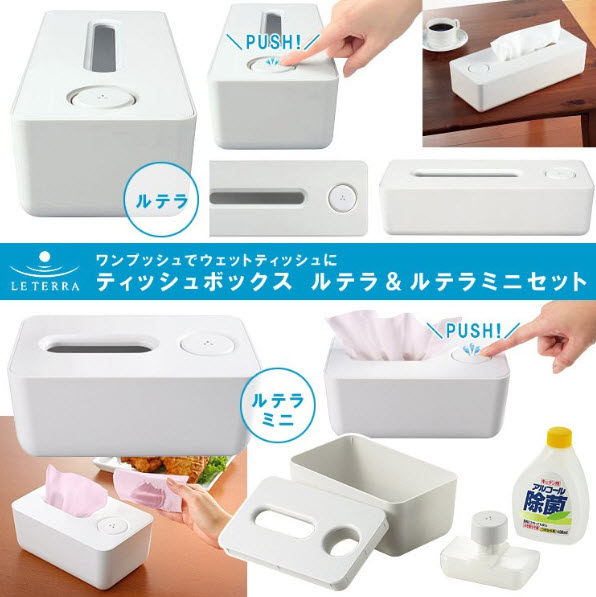 汚れた手や机をウェットテッシュで拭きたいな・・・と 思ったら、ティッシュを1枚取って、ボタンを押すと 簡単に除菌用アルコールティッシュに早変わり! 優れものだと思いませんか? ご家族にも一人暮らしにも重宝すること間違いなしです。