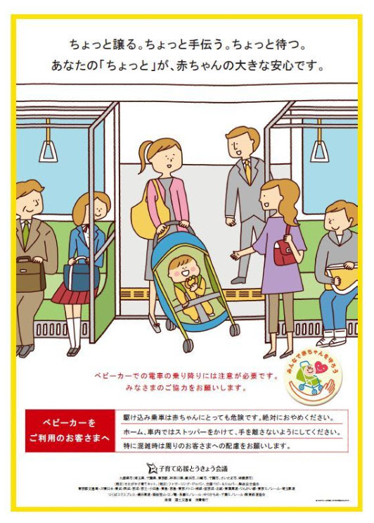 数年前は、ベビーカーは畳んで乗るが常識と言われていたの ですが、子供を抱いて、沢山の荷物を持って、さらにベビーカーを 畳んで持って運ぶ姿は、見ているこちらがヒヤヒヤしたものです。