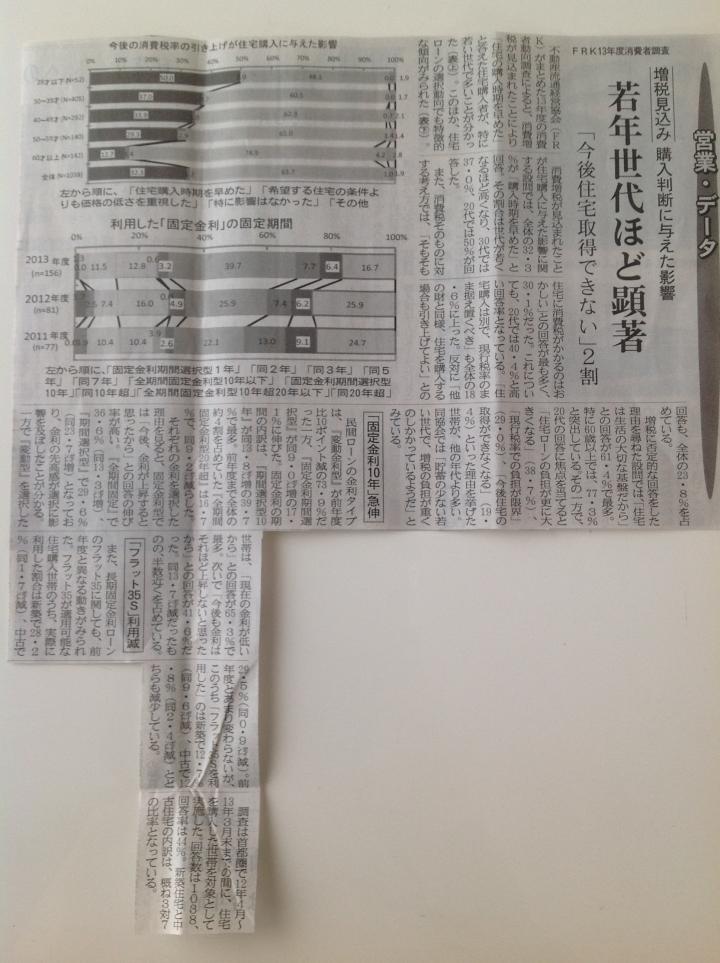こんにちは。 先日、団塊ジュニアと呼ばれる50代・60代)の方の売買購入が 減少してきているお話しをさせていただきました。 今回は、それとは対照的に若年世代(20代の方)売買購入が好調 だそうです。 増税が決定され、購入時期を早めたとの記事がありました。 住宅ローンの選択動向でもフラット35を利用される方が 減ってきているとのこと。 若い方の購買意欲が沸くような物件をどんどん御紹介出来るよう 我が社も奮起してまいります!