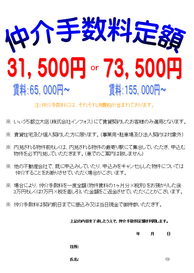 そこで、弊社ではお客様に来訪していただくシステムを一掃し 新たなサービスを考えました。 気になる物件があったら、お客様から御依頼をいただき、しかも 現地(もしくは現地最寄り駅)で集合し、内見していただくシステム! ただし、お客様にはお手間をおかけ頂いた代わりに仲介手数料も 定額で安い! もしかしたら、手抜きと言われてしまうかもしれませんが・・・。 どうですか?ちょっと気になっていただけましたか? ご自身はもちろん、お知り合いの方で賃貸物件をお探しであれば ぜひ教えてさしあげて下さい。 |