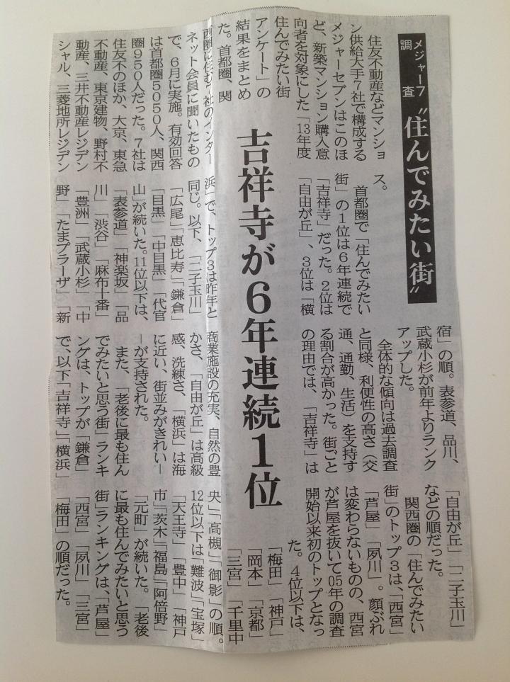 トップ3は、1位 吉祥寺、2位 自由が丘、3位横浜。 このトップ3は去年と同じだそうです。 以下、二子玉川、広尾、恵比寿、鎌倉、目黒、中目黒と 続くそうです。
