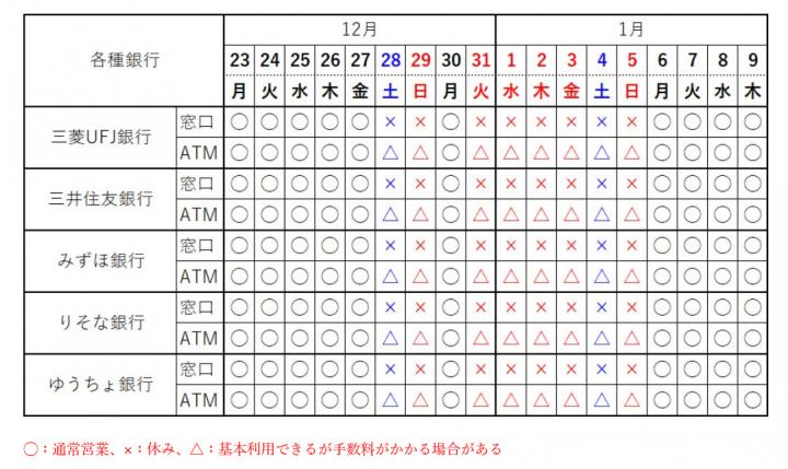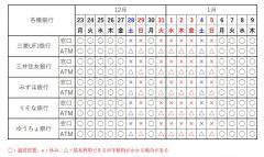 こんにちは。 銀行は、毎年29日まで。だから今年は27日まで。 そう思い込んでいました。 27日に銀行へ行き、今年はこれが最後と思いながら 年末年始の営業日という張り紙を見たところ・・・