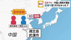 新型コロナウイルスに感染した30代の中国人男性は、中国の 武漢市に滞在中に肺炎患者と接触。 1月3日に発熱し、その3日後の6日に日本に帰国。 空港には検疫所があり、高い熱がある渡航者を検知するための サーモグラフィーによる確認を行っているが、解熱剤を飲んで いて検知されなかったそうです。