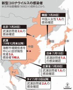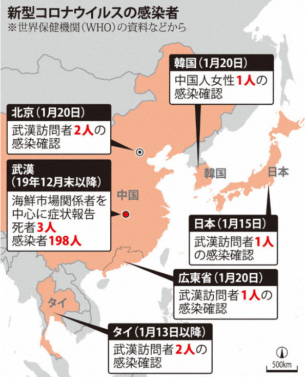 こんにちは。 中国湖北省武漢市の衛生当局は20日、2019年末から集団感染の広がる 新型コロナウイルスによる肺炎で、18日に新たに1人が死亡したと発表 したそうです。死者は計3人に。 中国では20日、武漢以外の感染が確認され感染者は計218人、タイ2人 日本1人に続き韓国でも新たに1人の感染がわかっているそうです。 感染者は全体で222人。